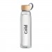 Glasflasche mit Verschluss aus Bambus und Schlaufe aus TPU. Nicht geeignet für kohlensäurehaltige Getränke. Füllmenge: 500 ml. Auslaufsicher. Bambus ist ein natürliches Produkt, es kann daher zu leichten Abweichungen in Farbe, Dekor und Maßen kommen.Position MotivDruckgrösseDruckart & FarbenVorderseite80x30mmGravare laser bis 0 Farben