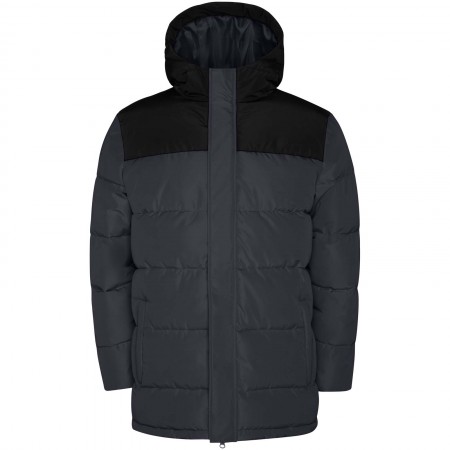 Wattierte Jacke mit fester Kapuze. Reißverschluss auf der Vorderseite, verdeckt durch eine Knopfleiste. Kinnschutz. Zwei Seitentaschen mit Reißverschluss. Elastische Bündchen.