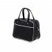 Tasche aus glänzendem, schwarzem PVC mit weißer Paspel. Verstärkte Griffe mit Metallnieten und Hauptfach mit Reißverschluss sowie Innentasche.